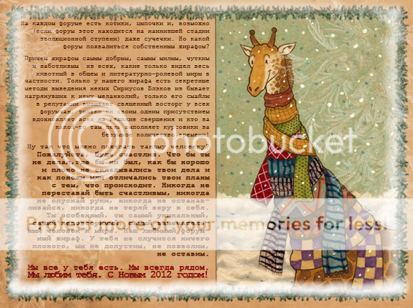 А эпиграф с жирафом забавный и теплый, это здорово. Тот Жираф, наверное, и правда, после такого подарка стал самым счастливым в мире с: